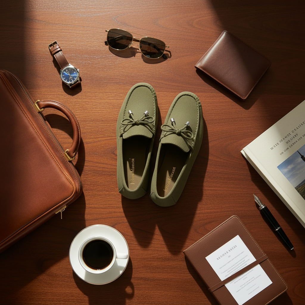 A sleek olive green slip-on loafer with a minimalist design, smooth texture, and subtle stitching—clean, modern, and easy to dress up or down.