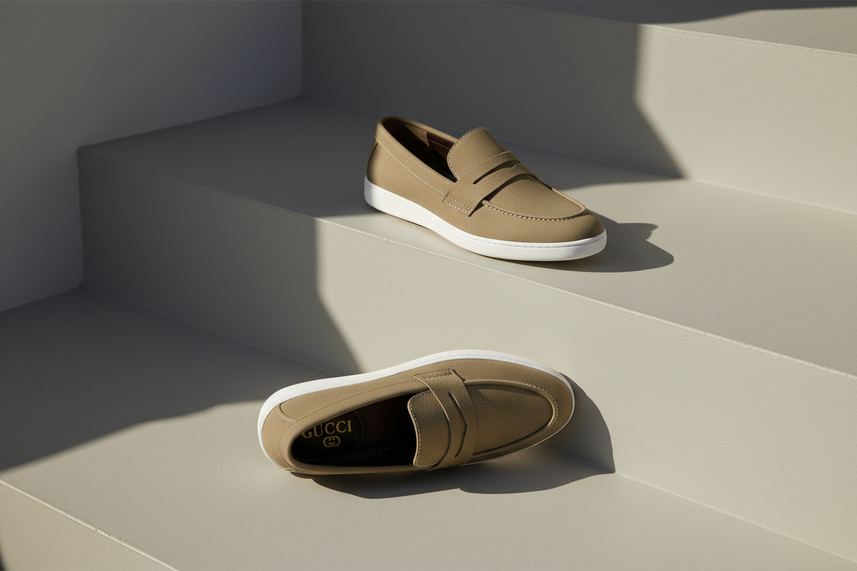 A sleek grey beige-on loafer with a minimalist design, smooth texture, and subtle stitching—clean, modern, and easy to dress up or down.